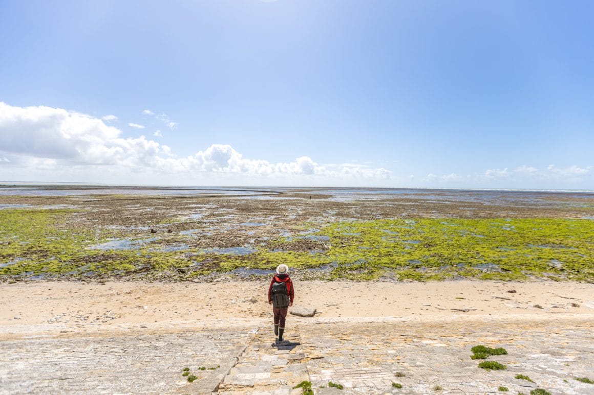 L’estran est la partie qui se découvre à marée basse. À première vue, une fois l’eau retirée, c’est un désert vide de toute forme de vie. L’estran est pourtant une réserve de biodiversité. On y trouve des algues, des coquillages, mais aussi des animaux qu’on ne connaissait pas comme le lièvre de mer. Avec Saphia, nous apprenons les bonnes pratique de la pêche à pied mais aussi l’histoire des Rétais et des écluses à poissons qui font parties du paysage des côtes de l’île de Ré.