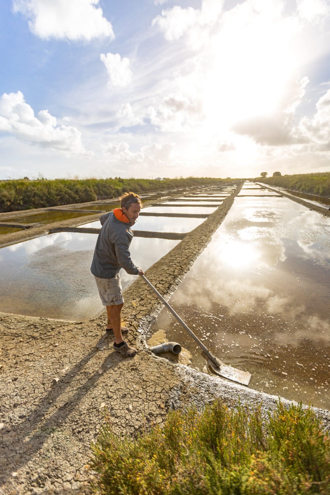 Romain organise des visites pour expliquer comment il produit son propre sel à la Couarde-sur-Mer. Ces visites permettent de mieux comprendre le métier de saunier.