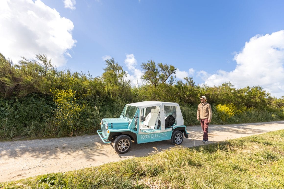 Vous avez aussi la possibilité de louer une mini-moke électrique. L’avantage c’est qu’il y a de la place pour 4 personnes et qu’on peut être à l’abri en cas de pluie. Les mini-moke électriques roulent assez lentement et ont une capacité de 40km donc on ne peut pas faire de grands trajets mais l’expérience est drôle 🙂